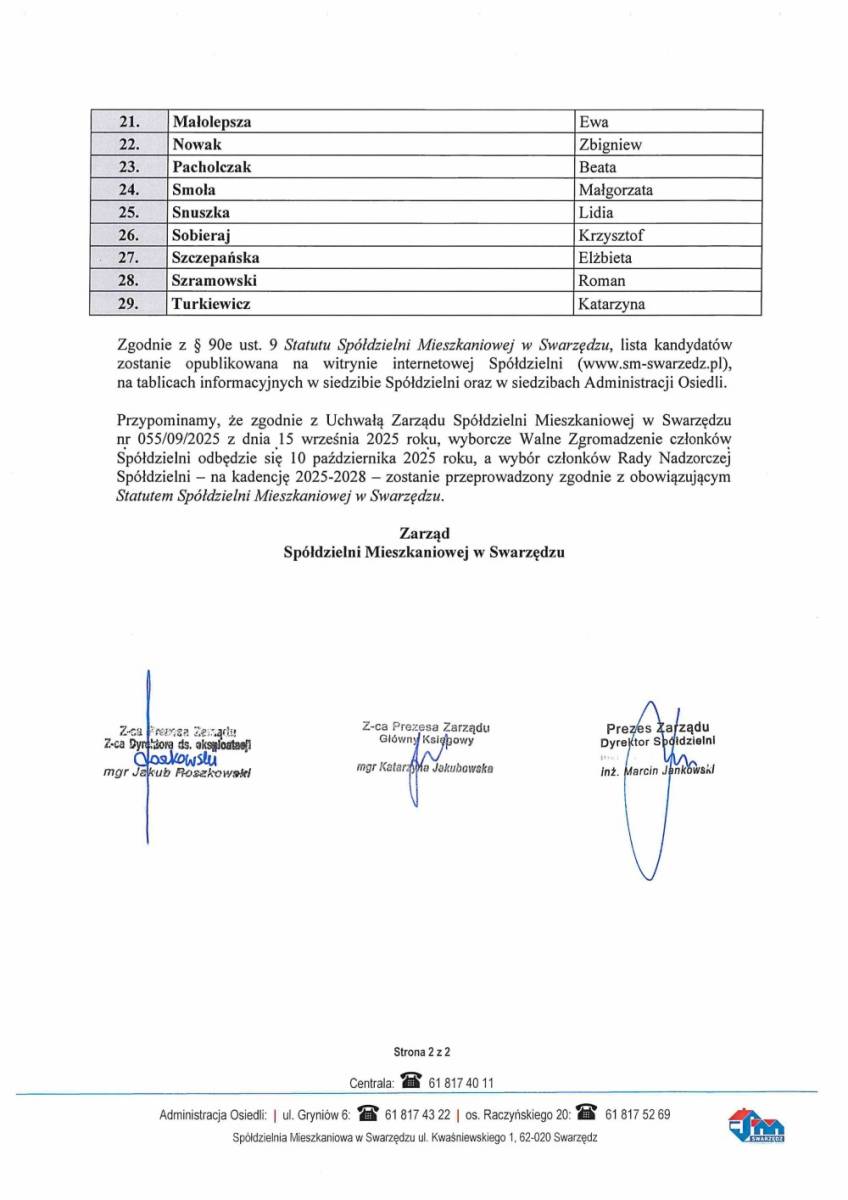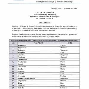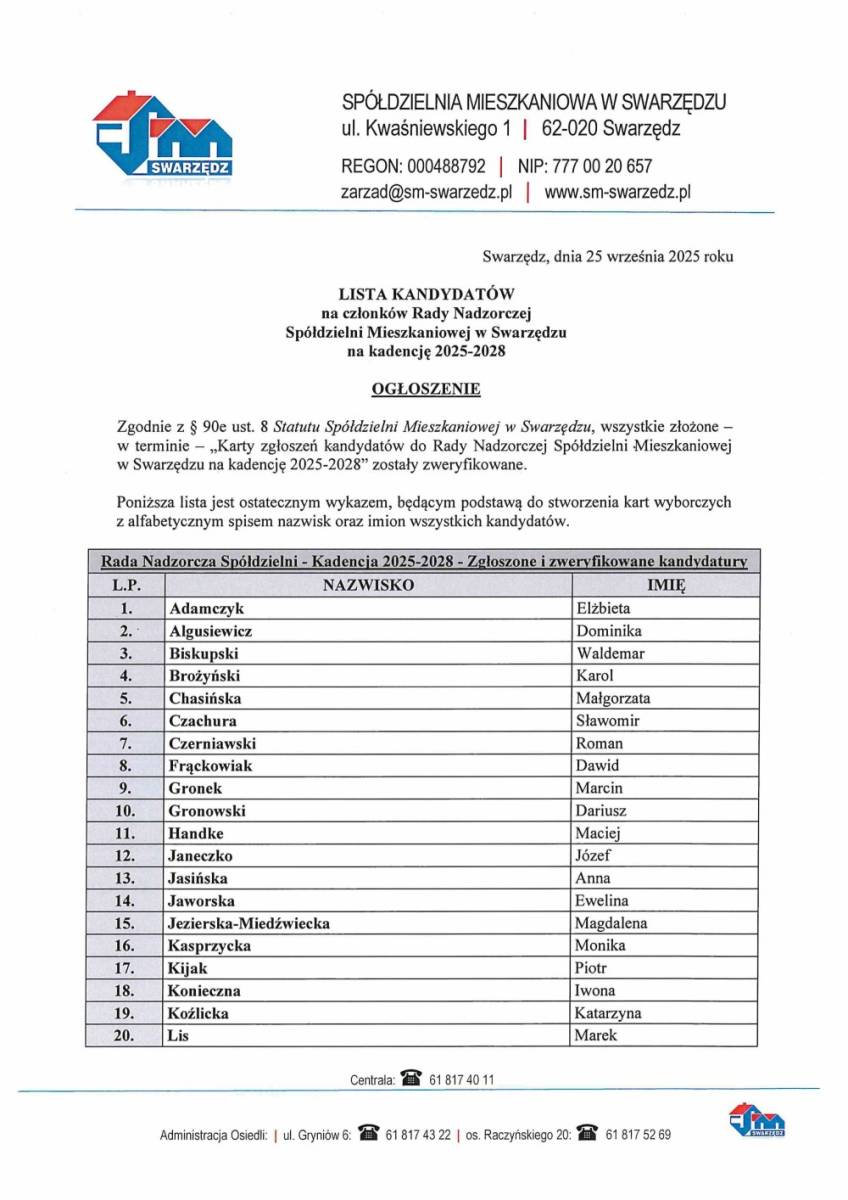 Lista kandydatów na członków Rady Nadzorczej Spółdzielni Mieszkaniowej w Swarzędzu w kadencji 2025-2028 dostępna jest poniżej.