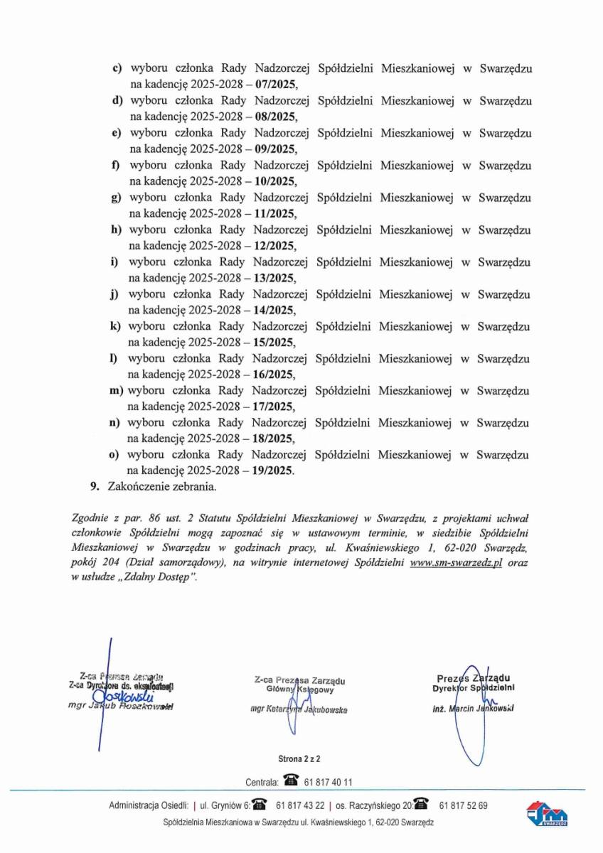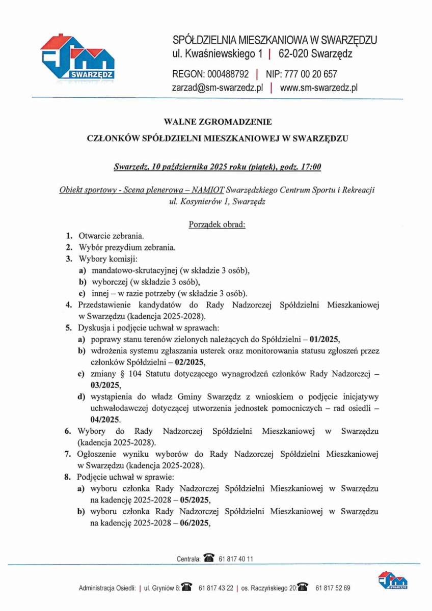 Publikujemy uzupełniony porządek obrad najbliższego Walnego Zgromadzenia Spółdzielni Mieszkaniowej w Swarzędzu. Informujemy, że minął ustawowy termin wnoszenia przez członków Spółdzielni projektów uchwał na październikowe Walne Zgromadzenie. Do Spółdzielni wpłynęło 10 projektów uchwał, z czego 4 zostały wprowadzone do porządku obrad.